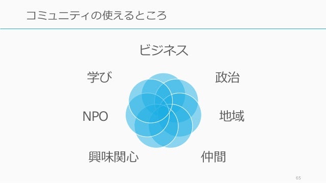 - 65. ビジネス 政治 地域 仲間興味関心 NPO 学び 65 コミュニティの使えるところ
