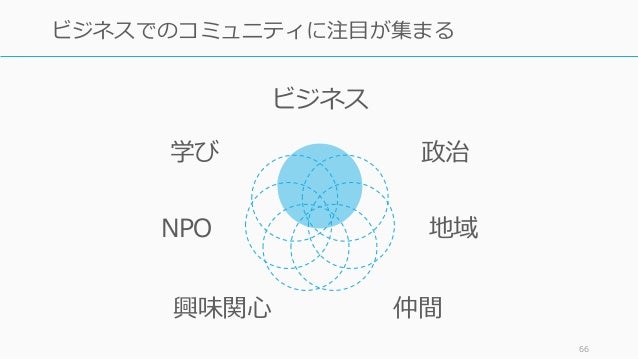 - 66. ビジネス 政治 地域 仲間興味関心 NPO 学び 66 ビジネスでのコミュニティに注目が集まる