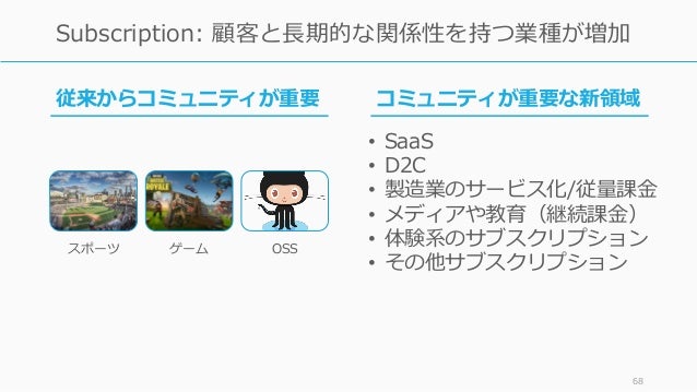 - 68. スポーツ ゲーム OSS 68 Subscription: 顧客と長期的な関係性を持つ業種が増加 従来からコミュニティが重要 コミュニティが重要な新領域 • SaaS • D2C • 製造業のサービス化/従量課金 • メディアや教育(継続課金) • 体験系のサブスクリプション • その他サブスクリプション