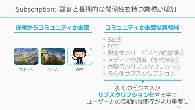 - 69. スポーツ ゲーム OSS 69 Subscription: 顧客と長期的な関係性を持つ業種が増加 従来からコミュニティが重要 コミュニティが重要な新領域 多くのビジネスが サブスクリプション化する中で ユーザーとの長期的な関係がより重要に • SaaS • D2C • 製造業のサービス化/従量課金 • メディアや教育(継続課金) • 体験系のサブスクリプション • その他サブスクリプション