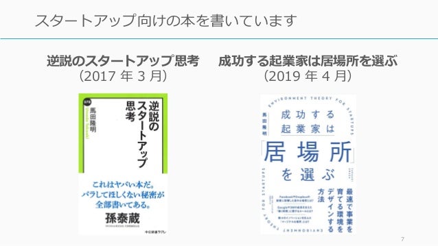 - 7. 7 スタートアップ向けの本を書いています 逆説のスタートアップ思考 (2017 年 3 月) 成功する起業家は居場所を選ぶ (2019 年 4 月)