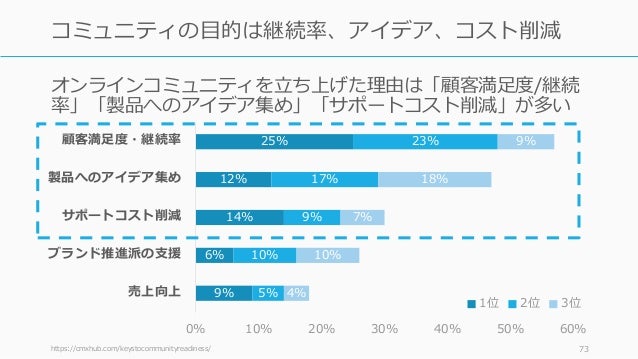 - 73. オンラインコミュニティを立ち上げた理由は「顧客満足度/継続 率」「製品へのアイデア集め」「サポートコスト削減」が多い 73 コミュニティの目的は継続率、アイデア、コスト削減 https://cmxhub.com/keystocommunityreadiness/ 9% 6% 14% 12% 25% 5% 10% 9% 17% 23% 4% 10% 7% 18% 9% 0% 10% 20% 30% 40% 50% 60% 売上向上 ブランド推進派の支援 サポートコスト削減 製品へのアイデア集め 顧客満足度・継続率 1位 2位 3位
