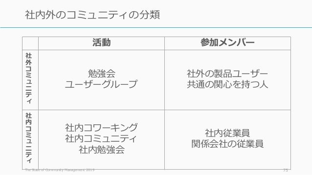 - 75. The State of Community Management 2019 75 社内外のコミュニティの分類 活動 参加メンバー 社 外 コ ミ ュ ニ テ ィ 勉強会 ユーザーグループ 社外の製品ユーザー 共通の関心を持つ人 社 内 コ ミ ュ ニ テ ィ 社内コワーキング 社内コミュニティ 社内勉強会 社内従業員 関係会社の従業員