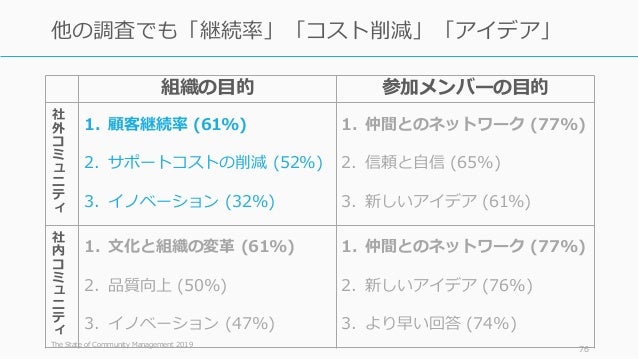 - 76. 組織の目的 参加メンバーの目的 社 外 コ ミ ュ ニ テ ィ 1. 顧客継続率 (61%) 2. サポートコストの削減 (52%) 3. イノベーション (32%) 1. 仲間とのネットワーク (77%) 2. 信頼と自信 (65%) 3. 新しいアイデア (61%) 社 内 コ ミ ュ ニ テ ィ 1. 文化と組織の変革 (61%) 2. 品質向上 (50%) 3. イノベーション (47%) 1. 仲間とのネットワーク (77%) 2. 新しいアイデア (76%) 3. より早い回答 (74%) The State of Community Management 2019 76 他の調査でも「継続率」「コスト削減」「アイデア」