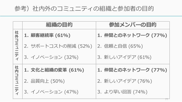 - 77. 組織の目的 参加メンバーの目的 社 外 コ ミ ュ ニ テ ィ 1. 顧客継続率 (61%) 2. サポートコストの削減 (52%) 3. イノベーション (32%) 1. 仲間とのネットワーク (77%) 2. 信頼と自信 (65%) 3. 新しいアイデア (61%) 社 内 コ ミ ュ ニ テ ィ 1. 文化と組織の変革 (61%) 2. 品質向上 (50%) 3. イノベーション (47%) 1. 仲間とのネットワーク (77%) 2. 新しいアイデア (76%) 3. より早い回答 (74%) 77 参考)社内外のコミュニティの組織と参加者の目的