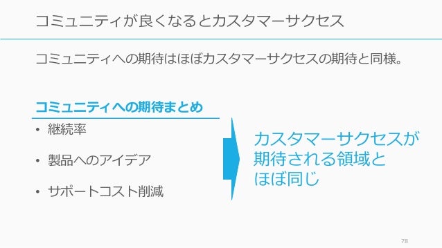 - 78. コミュニティへの期待はほぼカスタマーサクセスの期待と同様。 78 コミュニティが良くなるとカスタマーサクセス コミュニティへの期待まとめ • 継続率 • 製品へのアイデア • サポートコスト削減 カスタマーサクセスが 期待される領域と ほぼ同じ
