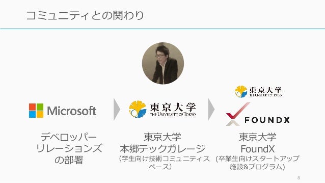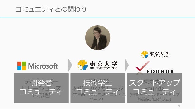 - 8. 8 コミュニティとの関わり デベロッパー リレーションズ の部署 東京大学 本郷テックガレージ (学生向け技術コミュニティス ペース) 東京大学 FoundX (卒業生向けスタートアップ 施設&プログラム)