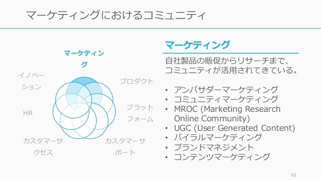 - 82. マーケティン グ プロダクト プラット フォーム カスタマーサ ポート カスタマーサ クセス HR イノベー ション 82 マーケティングにおけるコミュニティ マーケティング 自社製品の販促からリサーチまで、 コミュニティが活用されてきている。 • アンバサダーマーケティング • コミュニティマーケティング • MROC (Marketing Research Online Community) • UGC (User Generated Content) • バイラルマーケティング • ブランドマネジメント • コンテンツマーケティング