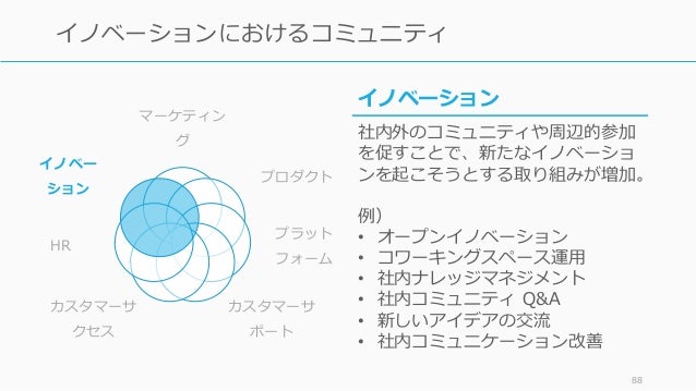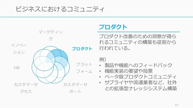 - 83. マーケティン グ プロダクト プラット フォーム カスタマーサ ポート カスタマーサ クセス HR イノベー ション 83 ビジネスにおけるコミュニティ プロダクト プロダクト改善のための洞察が得ら れるコミュニティの構築も従前から 行われている。 例) • 製品や機能へのフィードバック • 機能実装の要望や投票 • ベータ版プロダクトコミュニティ • サプライヤや流通業者など、社外 との拡張型ナレッジシステム構築