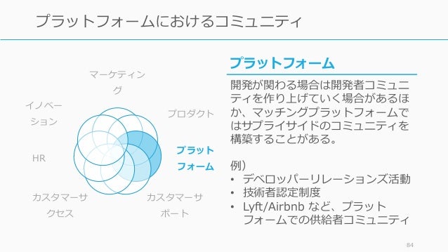 - 84. マーケティン グ プロダクト プラット フォーム カスタマーサ ポート カスタマーサ クセス HR イノベー ション 84 プラットフォームにおけるコミュニティ プラットフォーム 開発が関わる場合は開発者コミュニ ティを作り上げていく場合があるほ か、マッチングプラットフォームで はサプライサイドのコミュニティを 構築することがある。 例) • デベロッパーリレーションズ活動 • 技術者認定制度 • Lyft/Airbnb など、プラット フォームでの供給者コミュニティ