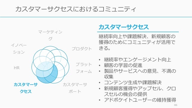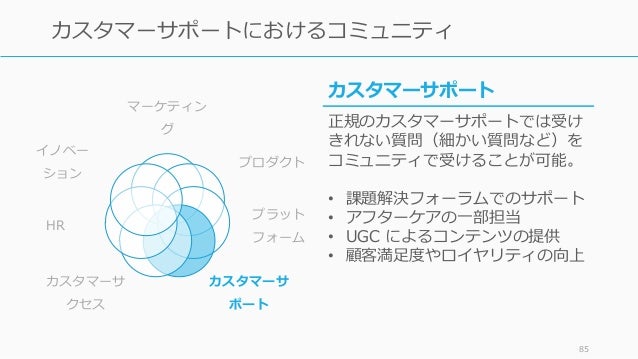 - 85. 85 カスタマーサポートにおけるコミュニティ カスタマーサポート 正規のカスタマーサポートでは受け きれない質問(細かい質問など)を コミュニティで受けることが可能。 • 課題解決フォーラムでのサポート • アフターケアの一部担当 • UGC によるコンテンツの提供 • 顧客満足度やロイヤリティの向上 マーケティン グ プロダクト プラット フォーム カスタマーサ ポート カスタマーサ クセス HR イノベー ション