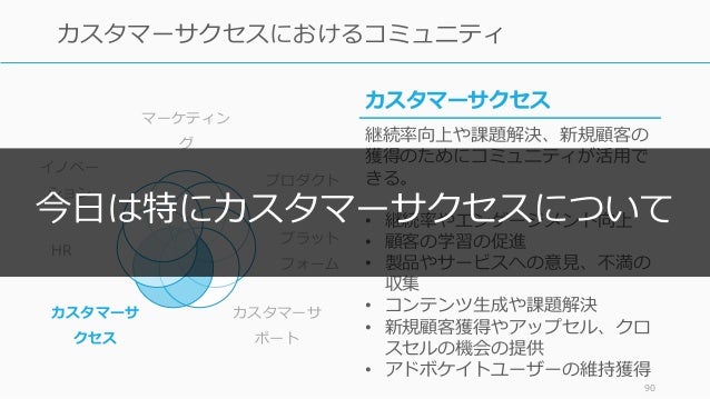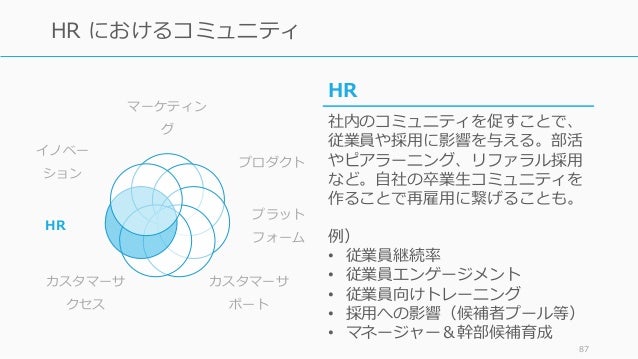 - 86. マーケティン グ プロダクト プラット フォーム カスタマーサ ポート カスタマーサ クセス HR イノベー ション 86 カスタマーサクセスにおけるコミュニティ カスタマーサクセス 継続率向上や課題解決、新規顧客の 獲得のためにコミュニティが活用で きる。 • 継続率やエンゲージメント向上 • 顧客の学習の促進 • 製品やサービスへの意見、不満の 収集 • コンテンツ生成や課題解決 • 新規顧客獲得やアップセル、クロ スセルの機会の提供 • アドボケイトユーザーの維持獲得