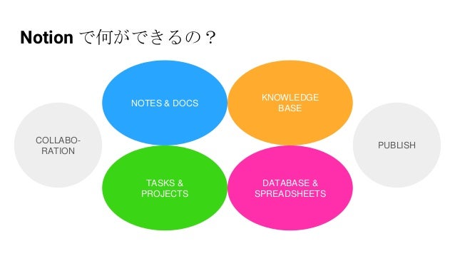 - 3. Notion で何ができるの? NOTES & DOCS KNOWLEDGE BASE TASKS & PROJECTS DATABASE & SPREADSHEETS COLLABO- RATION PUBLISH
