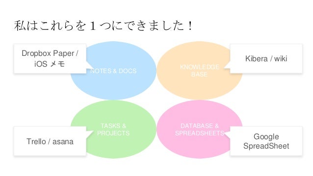 - 4. 私はこれらを1つにできました! NOTES & DOCS KNOWLEDGE BASE TASKS & PROJECTS DATABASE & SPREADSHEETS Dropbox Paper / iOS メモ Trello / asana Kibera / wiki Google SpreadSheet