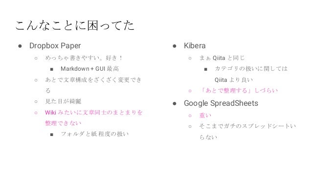 - 5. ● Dropbox Paper ○ めっちゃ書きやすい。好き! ■ Markdown + GUI 最高 ○ あとで文章構成をざくざく変更でき る ○ 見た目が綺麗 ○ Wiki みたいに文章同士のまとまりを 整理できない ■ フォルダと紙 程度の扱い こんなことに困ってた ● Kibera ○ まぁ Qiita と同じ ■ カテゴリの扱いに関しては Qiita より良い ○ 「あとで整理する」しづらい ● Google SpreadSheets ○ 重い ○ そこまでガチのスプレッドシートい らない