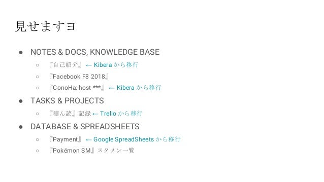 - 6. ● NOTES & DOCS, KNOWLEDGE BASE ○ 『自己紹介』 ← Kibera から移行 ○ 『Facebook F8 2018』 ○ 『ConoHa; host-***』 ← Kibera から移行 ● TASKS & PROJECTS ○ 『積ん読』記録 ← Trello から移行 ● DATABASE & SPREADSHEETS ○ 『Payment』 ← Google SpreadSheets から移行 ○ 『Pokémon SM』スタメン一覧 見せますヨ