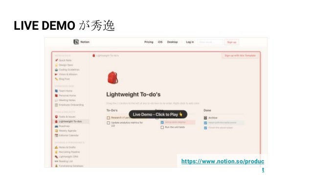 - 8. LIVE DEMO が秀逸 https://www.notion.so/produc t