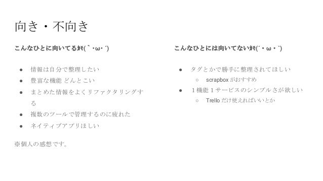 - 9. 向き・不向き ● 情報は自分で整理したい ● 豊富な機能 どんとこい ● まとめた情報をよくリファクタリングす る ● 複数のツールで管理するのに疲れた ● ネイティブアプリほしい ※個人の感想です。 ● タグとかで勝手に整理されてほしい ○ scrapbox がおすすめ ● 1機能1サービスのシンプルさが欲しい ○ Trello だけ使えればいいとか こんなひとに向いてるカモ(`・ω・ ´) こんなひとには向いてないカモ(´・ω・`)